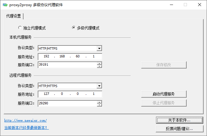 proxy2proxy多级协议代理软件是一款支持HTTP/HTTPS 协议网络代理的软件,能够提供单级/多级协议代理服务,支持与第三方代理软件配合使用,就算宿主系统仅支持本机(127.0.0.1)代理,也能够实现虚拟机环境正常享受协议代理服务。